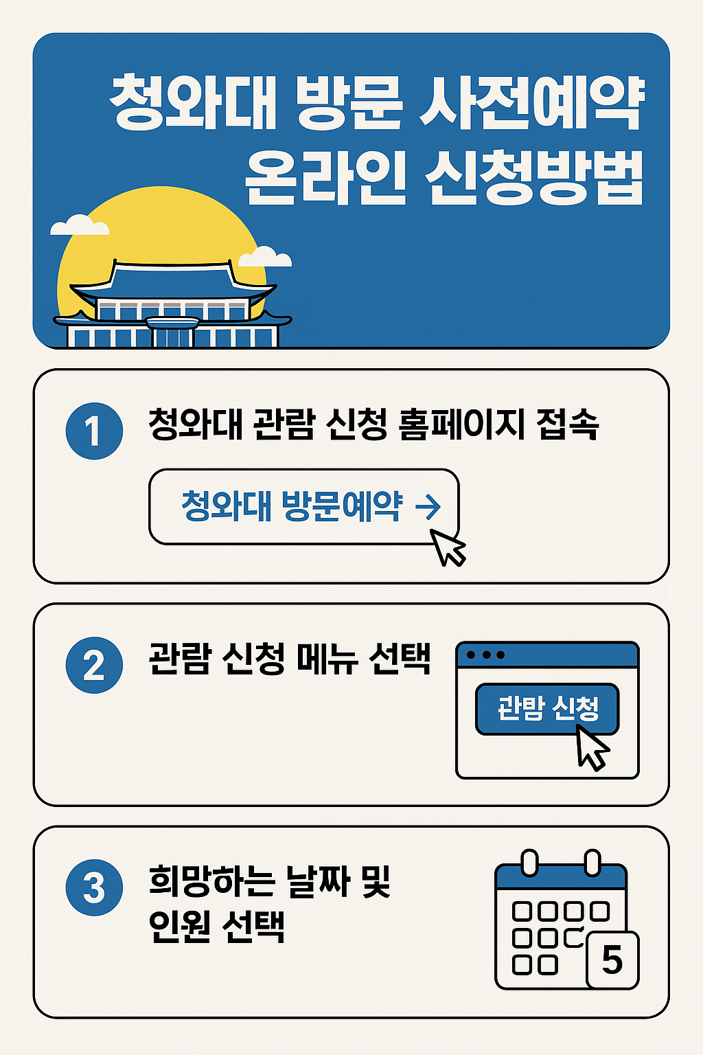 청와대 관람은 전용 누리집 또는 모바일 앱을 통해 간편하게 신청할 수 있습니다. 아래 절차를 따라주세요.