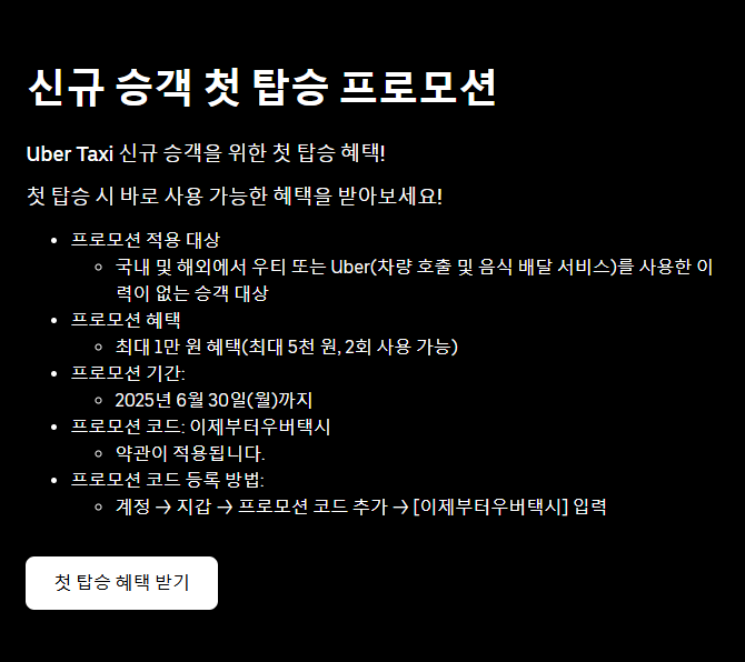 우버택시 할인 혜택은 우버 앱을 처음 사용하는 신규 가입자에게만 제공됩니다. 기존 이용자는 본 혜택 대상이 아니며, 계정당 1회만 사용 가능합니다.